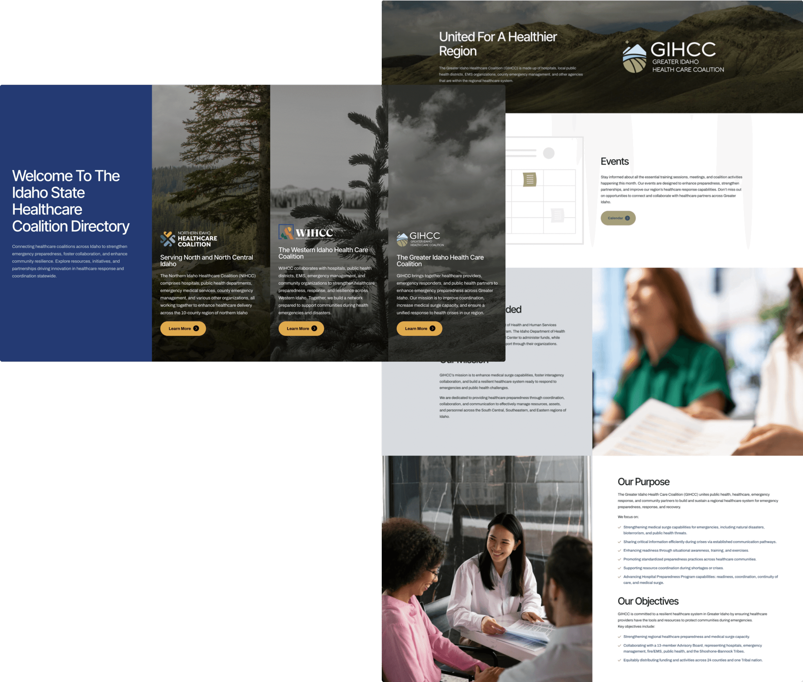 Following the successful completion of NIHCC’s branding, Bahlr undertook the significant task of developing a comprehensive website that served not only NIHCC but also the Greater Idaho Healthcare Coalition (GIHCC) and the Western Idaho Healthcare Coalition (WIHCC). This ambitious project aimed to unify the efforts of all three coalitions under one digital roof. Bahlr designed a homepage that effectively introduced and directed users to the specific coalition relevant to their needs. Once users selected their coalition, they could seamlessly navigate through an array of custom features, including an integrated calendar for events and meetings, accessible documents, and messaging tools. This cohesive platform streamlined user experience and reinforced the interconnectedness of Idaho’s healthcare coalitions, promoting collaboration and accessibility across the state.